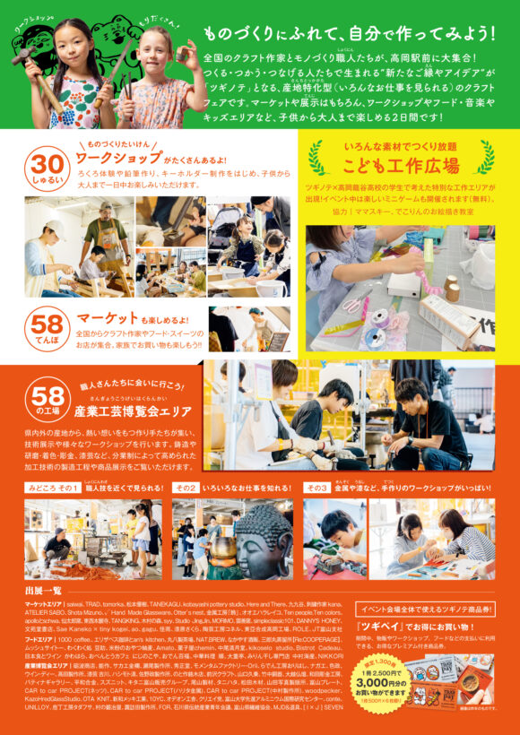 全国のクラフト作家とモノづくり職人たちが、高岡市で一堂に会します。つくる・つかう・つなげる人たちで生まれる“新たなご縁やアイデア”が、それぞれにとっての「ツギノテ」となる、産地特化型のクラフトフェアです。マーケットや展示はもちろん、ワークショップやフード・音楽やキッズエリアなど、子どもから大人までモノづくりを楽しめる2日間です。
